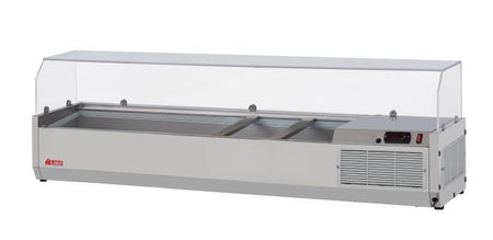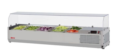 E-Line Countertop Salad Table, with clear hood, 48-3/8″L, side mounted self-contained refrigeration, accommodates (5) GN 1/4 size x 6″ deep condiment pans (pans not included), digital temperature display on front panel, static cooling system, R290 Hydrocarbon refrigerant, stainless steel interior &, exterior, 1/6 HP, 115V/60/1, 1.3 Amps, NEMA 5-15P, cETLus, ETL-Sanitation (contact sales for lead time)