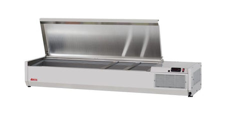 E-Line Countertop Salad Table, 59″L, side mounted self-contained refrigeration, accommodates (12) GN 1/6 size or (6) GN 1/3 size 6″ deep condiment pans (pans not included), digital temperature display on front panel, static cooling system, R290 Hydrocarbon refrigerant, stainless steel interior &, exterior, 1/6 HP, 115V/60/1, 2 Amps, NEMA 5-15P, cETLus, ETL-Sanitation (contact sales for lead time)
