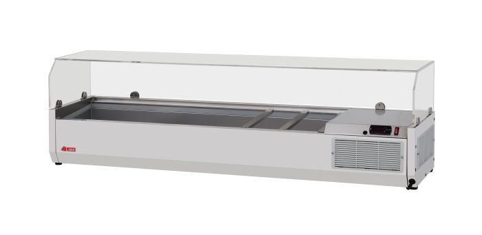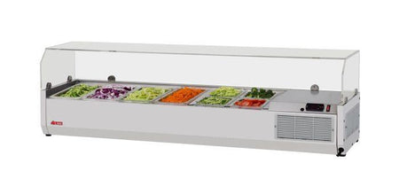 E-Line Countertop Salad Table, with clear hood, 59″L, side mounted self-contained refrigeration, accommodates (12) GN 1/6 size or (6) GN 1/3 size 6″ deep condiment pans (pans not included), digital temperature display on front panel, static cooling system, R290 Hydrocarbon refrigerant, stainless steel interior &, exterior, 1/6 HP, 115V/60/1, 2 Amps, NEMA 5-15P, cETLus, ETL-Sanitation (contact sales for lead time)
