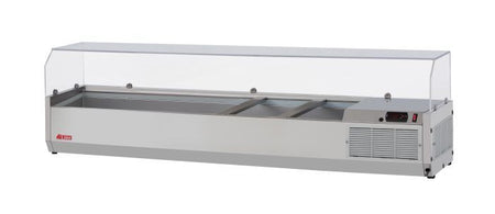 E-Line Countertop Salad Table, with clear hood, 60-1/4″L, side mounted self-contained refrigeration, accommodates (7) GN 1/4 size x 6″ deep condiment pans (pans not included), digital temperature display on front panel, static cooling system, R290 Hydrocarbon refrigerant, stainless steel interior &, exterior, 1/6 HP, 115V/60/1, 1.3 Amps, NEMA 5-15P, cETLus, ETL-Sanitation (contact sales for lead time)