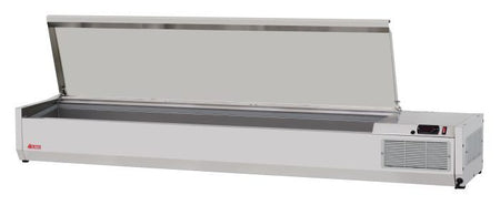 E-Line Countertop Salad Table, 70-7/8″L, side mounted self-contained refrigeration, accommodates(16) GN 1/6 size or (8) GN 1/3 size 6″ deep condiment pans (pans not included), digital temperature display on front panel, static cooling system, R290 Hydrocarbon refrigerant, stainless steel interior &, exterior, 1/6 HP, 115V/60/1, 2 Amps, NEMA 5-15P, cETLus, ETL-Sanitation (contact sales for lead time)