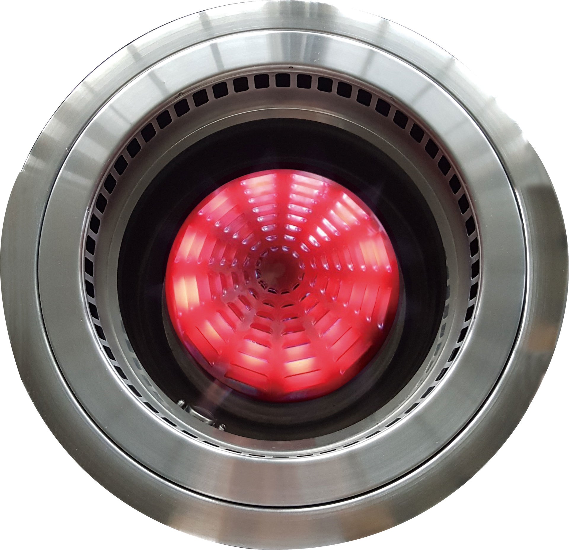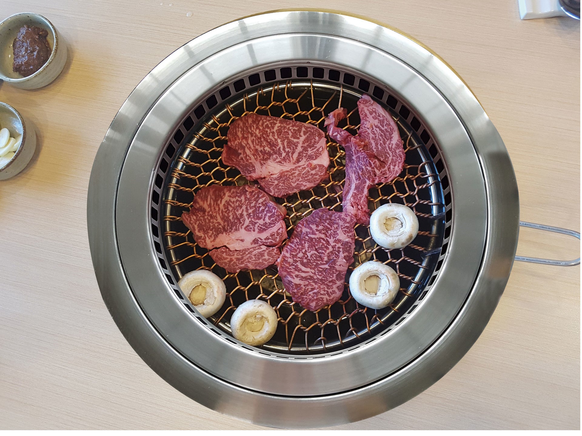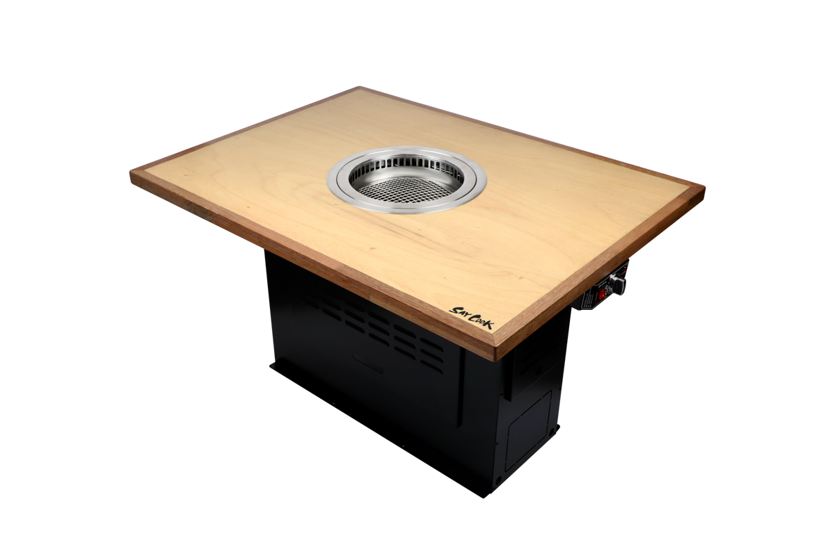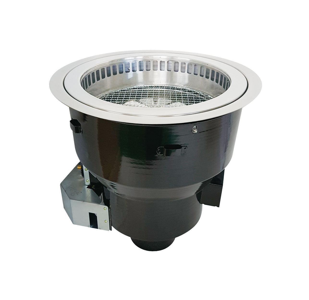 This is a top-quality roaster that captures the juices of the meat and grills it until golden brown on the outside. This product has the function of exhausting smoke downward and discharging it to the bottom. It is an aerodynamic design that absorbs smoke rising upward and exhausts it downward, preventing the meat from drying out. This product is designed to maintain customer convenience and meat taste at its best, along with the advantages of a clean business environment and effective use of table space. Additionally, the head burner is wrapped with brass to minimize damage, ensuring high heating power and a long lifespan.