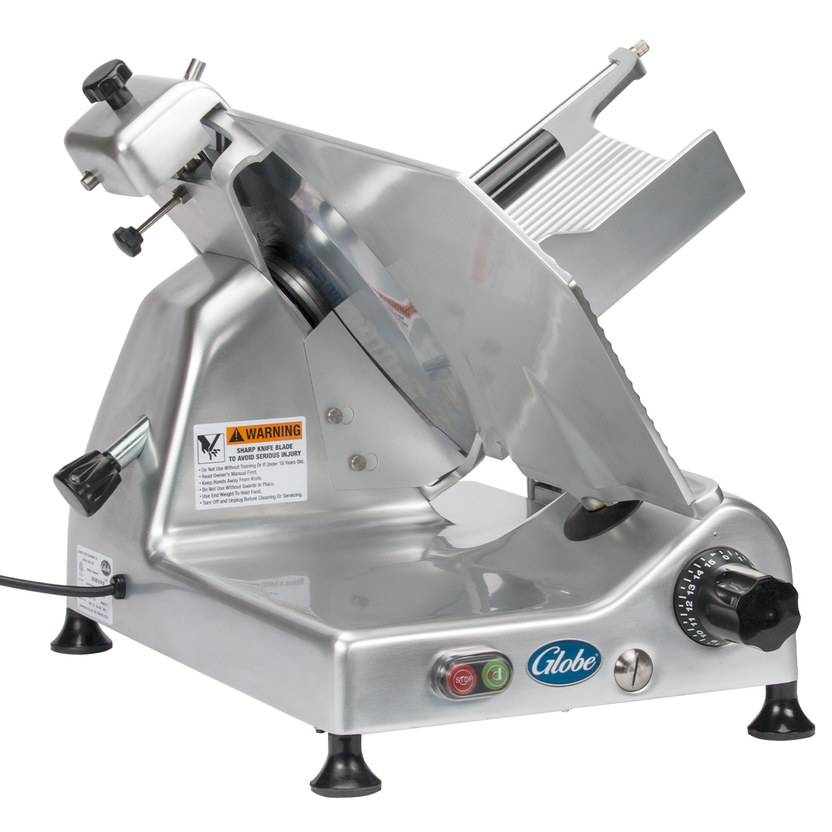 Globe's G14 slicer is perfect for mid-volume operations. The enhanced features of the G-Series generate optimal slicing quality for meat and cheese. The extended rod, end weight and chute can accommodate product up to 10.5" in length and the pyramid-shaped end weight teeth improve product hold during slicing. No other medium-duty slicers offer a premium 2-year warranty.