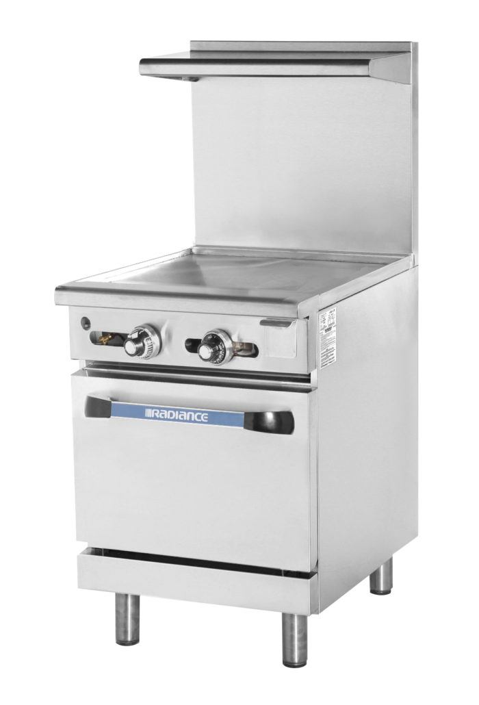 Radiance Heavy Duty Restaurant Range, natural gas, 24″W, thermostatically controlled griddle, stainless steel front, sides & back riser, lift-off high shelf, stainless steel oven interior/26.3” depth standard oven base, crumb tray, fully adjustable oven thermostat providing temperatures from 250°F-550°F, 79,000 BTU total, 6″ stainless steel legs,