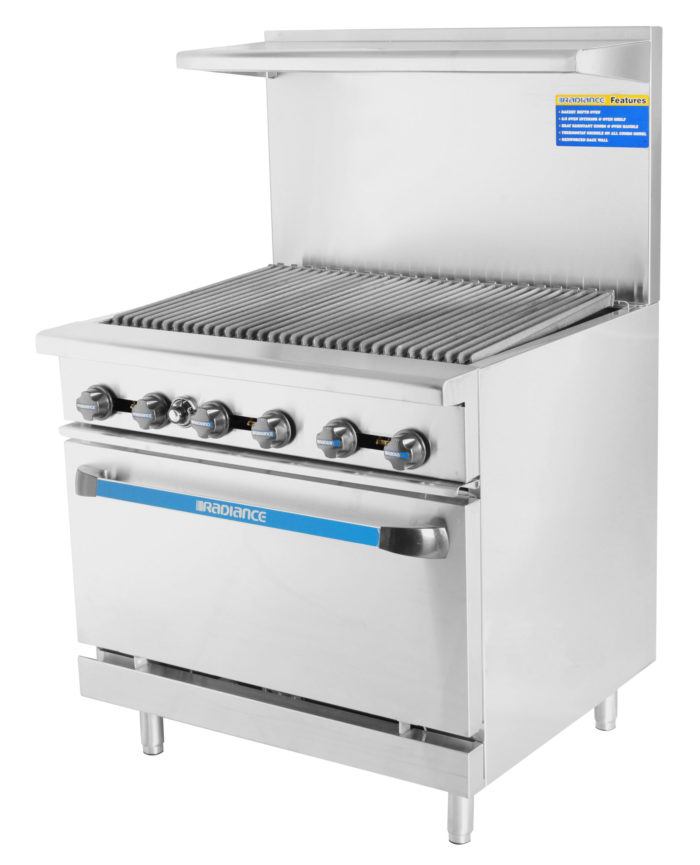 Radiance Heavy Duty Range, 36″W, Radiant broiler top, Thermostatically controlled, Heavy duty cast-iron radiant, Stainless steel front, sides & back riser, Lift-off high shelf, Stainless steel oven interior/26.3” depth standard oven base, Crumb tray, Fully adjustable thermostat, 250°F-550°F, 125,000 BTU total 6″ stainless steel legs
