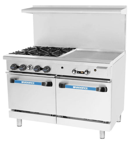 Radiance Restaurant Range, 48″W, (4) 32,000 BTU Open Burners, 24″ Griddle (right side), 2 standard ovens w/(1) rack, Stainless steel ext. at front, Sides & back riser lift-off high shelf, Full stainless steel oven interior, Adjustable oven thermostat, 26.3″ depth standard, 6″ stainless steel adjustable legs standard, Regulator included, 243,000 BTU total