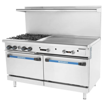 Radiance Restaurant Range, 60″W, (4) 32,000 BTU Open Burners, 36″ Griddle (right side), 2 standard ovens w/(1) rack, Stainless steel ext. at front, Sides & back riser lift-off high shelf, Full stainless steel oven interior, Adjustable oven thermostat, 26.3″ depth standard, 6″ stainless steel adjustable legs standard, Regulator included, 257,000 BTU total