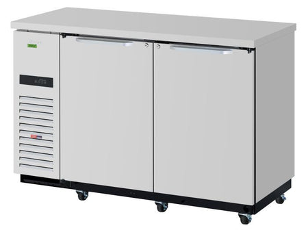Super Deluxe Back Bar Cooler, two-section, (2) solid doors, 58-3/4″L x 27-1/4″D x 37-1/8″H, 19 cu.ft., side mount self-contained refrigeration, self-cleaning condenser device, front breathing, (2) doors with locks, LED interior light, (6) stainless steel wire shelves, stainless steel exterior and interior, R600a Hydrocarbon refrigerant, 1/5 HP, 115v/60/1-ph, 1.7 amps, cord with NEMA 5-15P, cETLus, ETL-Sanitation, ENERGY STAR® (Contact sales for lead time)