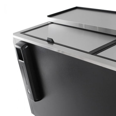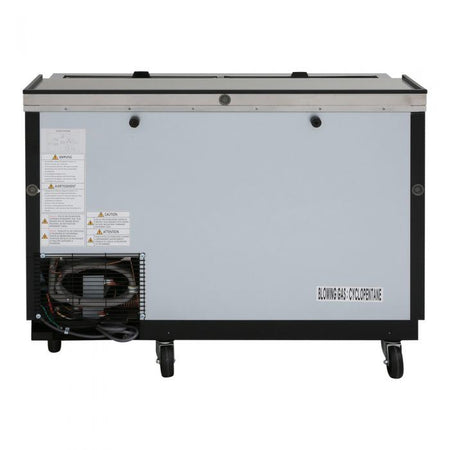 Super Deluxe Bottle Cooler, 50″W x 26-1/2″D x 33-1/4″H, 13.5 cu.ft., self-cleaning condenser equipped, self-contained, (3) PE coated adjustable dividers, built-on removable bottle cap opener &, catcher, (2) sliding lids, stainless steel countertop &, lid, black laminated exterior, stainless steel inside walls &, floor, galvanized steel interior top, side mount compressor, front breathing, (5) casters standard, R600a Hydrocarbon refrigerant, 1/5 HP, 115V/60/1, 1.7 Amps, cord with NEMA 5-15P, cETLus, ETL-Sanitation