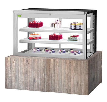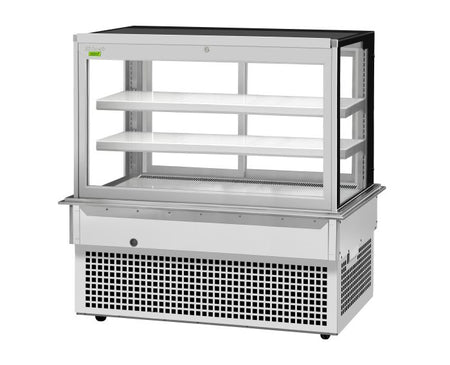 Drop-In Refrigerated Bakery Display Case, 61-3/4″L, 21.8 cu. ft. capacity, self-contained refrigeration with self-cleaning condenser, straight front tilt-out tempered glass, tempered glass side pannels, sliding rear doors, digital temperature controller, (2) adjustable tempered glass shelves with stainless steel front &, back edges, LED interior lighting, stainless steel floor &, airflow grille, 3″ swivel casters (rear locking), R290 Hydrocarbon refrigerant, 3/4 HP, 115V/60/1, 8.7 Amps, cord with NEMA 5-15P, cETLus, ETL-Sanitation (Contact sales for lead time)
