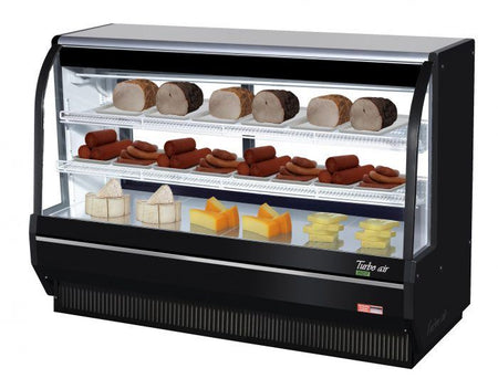 Direct cooling type deli cases, 72″ length, Self-Cleaning Condenser equipped, Hydrocarbon refrigerants (R-290), Curved front &, side glass, LED interior lighting under each shelf, Low-E coated &, tempered double pane glass, sliding rear doors, Cantilever PE coated shelves adjustable up/down/tilted, Rear access to compressor compartment, 115V/60/1, NEMA 5-15P, 7.8 Amps, 3/4 HP, 24.7 cu. ft., cETLus, ETL-Sanitation