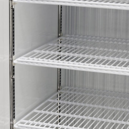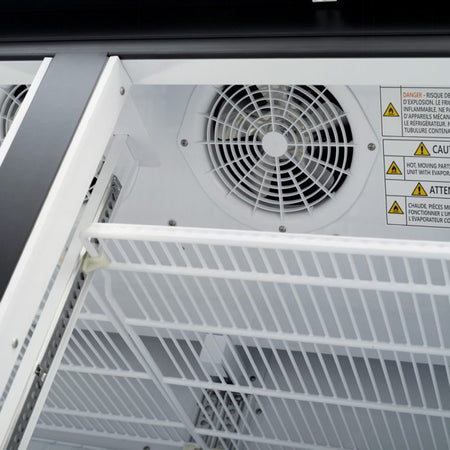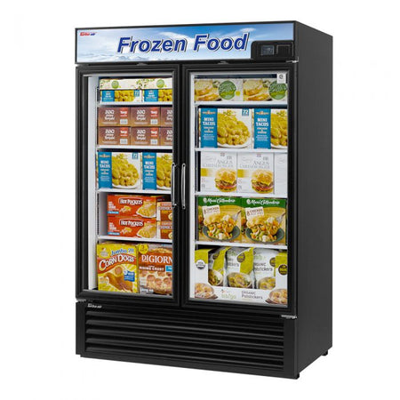 Standard glass door freezer, Two-section, LED interior lighting, (2) triple pane heated glass door, (8) adjustable, heavy-duty PE coated shelves, LED advertising panel, Anti-corrosion coated evaporator, Black cabinet, 39.88 cu.ft., 115V/60/1, NEMA 5-20P, 9.8 Amps, 1 HP, ETL-Sanitation, cETLus