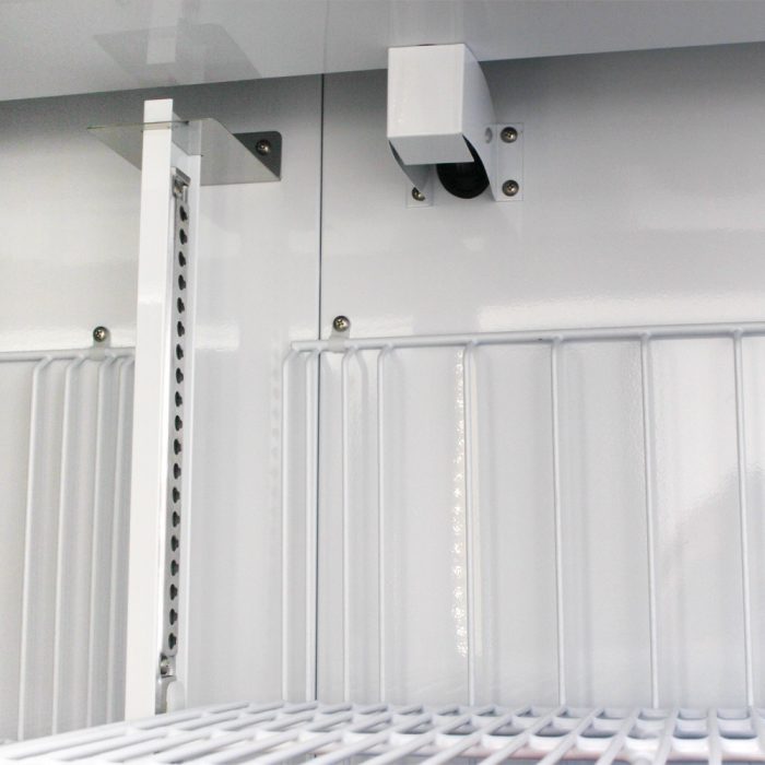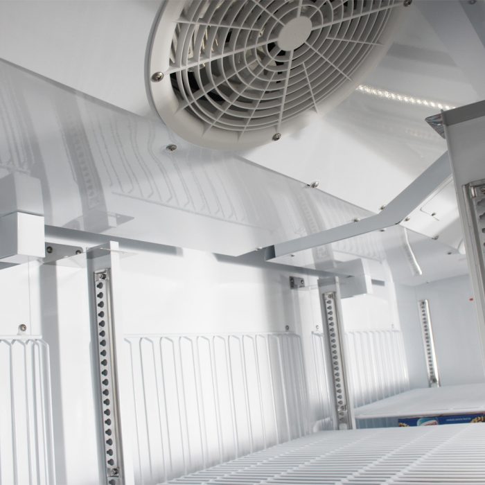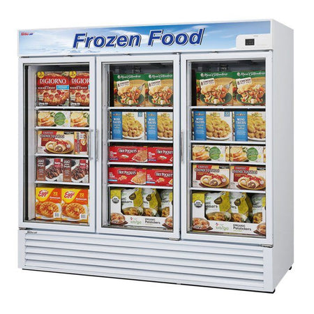 Standard glass door freezer, Three-section, LED interior lighting, (3) triple pane heated glass door, (12) adjustable, heavy-duty PE coated shelves, LED advertising panel, Anti-corrosion coated evaporator, White cabinet, 58.45 cu.ft., 115V/60/1, NEMA 5-20P, 15.2 Amps, 2/3HP x 2, ETL-Sanitation, cETLus