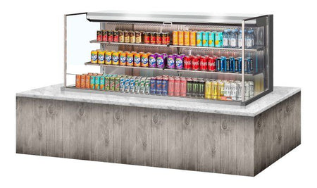 Drop-In Horizontal Open Display Case, low profile, 23.4 cu. ft. capacity, 71-7/8″W x 33″D x 52-1/2″H, self-contained refrigeration with self-cleaning condenser, (2) tiers with (4) glass shelves + deck, tempered glass front shield &, side walls, solar digital thermometer, digital electronic thermostat with defrost control, LED interior lighting, stainless steel interior &, exterior, back wall &, deck pan, front air intake &, rear air discharge, includes night cover, R290 Hydrocarbon refrigerant, (4) 3/4 HP, 220V/60/1, 13.0 Amps, cord with NEMA 6-20P, cETLus, ETL-Sanitation (Contact sales for lead time)