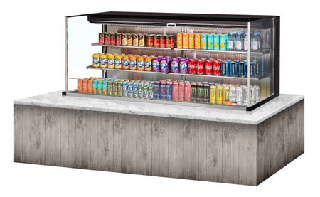 Drop-In Horizontal Open Display Case, low profile, 23.4 cu. ft. capacity, 71-7/8″W x 33″D x 52-1/2″H, self-contained refrigeration with self-cleaning condenser, (2) tiers with (4) glass shelves + deck, tempered glass front shield &, side walls, solar digital thermometer, digital electronic thermostat with defrost control, LED interior lighting, stainless steel interior, back wall &, deck pan, specify exterior color, front air intake &, rear air discharge, includes night cover, R290 Hydrocarbon refrigerant, (4) 3/4 HP, 220V/60/1, 13.0 Amps, cord with NEMA 6-20P, cETLus, ETL-Sanitation (Contact sales for lead time)