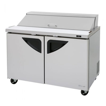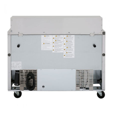 Super Deluxe sandwich/salad unit, Two-section, Self-Cleaning Condenser, Digital temperature control &, monitor system, Cold Bunker system, Stainless steel top with refrigeration pan rail, LED interior lighting &, fan control, (12) condiment pans included, 9-1/2″ deep removable HDPE cutting board, stainless steel interior and exterior, ABS door liner, Insulated pan cover, (2) doors with recessed handles, (2) stainless steel shelves, 4″ casters, Anti-corrosion coated evaporator, Self-contained, 12 cu.ft., 115V/60/1, NEMA 5-15P, 4.4 Amps, 1/3 HP, ETL-Sanitation, cETLus
