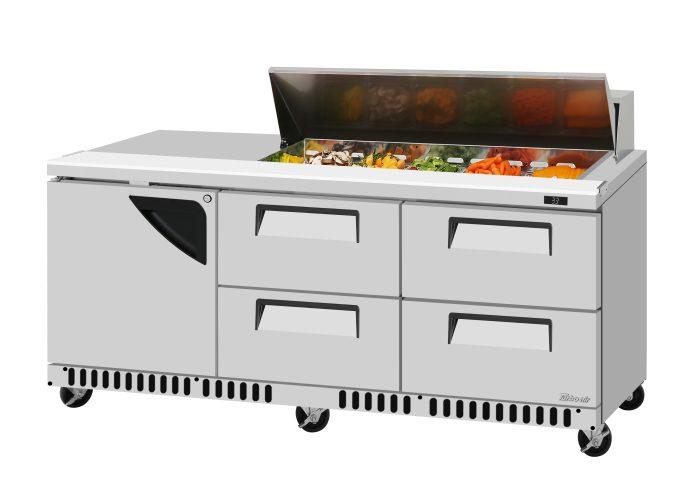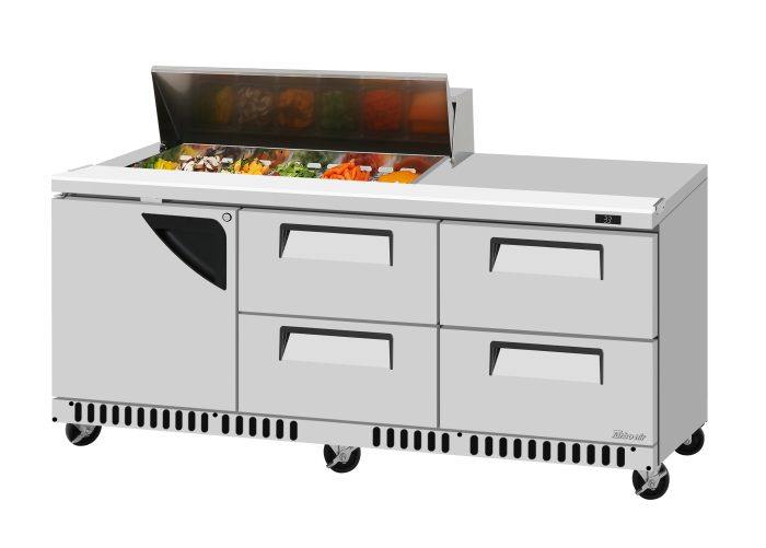 Super Deluxe Sandwich/Salad Prep + Work Station, Front Breathing airflow, Three-section, 72-5/8″W x 30″D x 37-5/8″H, 20.5 cu. ft., (12) 1/6 size 4″ deep pans, (4) drawers, (1) solid door, (1) stainless steel shelf, cold air compartment, insulated pan cover, 9-1/2″D cutting board, digital temperature control &, monitoring system, LED interior lighting &, fan control, stainless steel interior &, exterior (galvanized steel back &, bottom), self-cleaning condenser equipped, R290 Hydrocarbon refrigerant, 3/8 HP, 115V/60/1, 9.9 Amps, NEMA 5-15P, cETLus, ETL-Sanitation, Made in USA (contact sales for lead time)