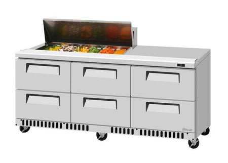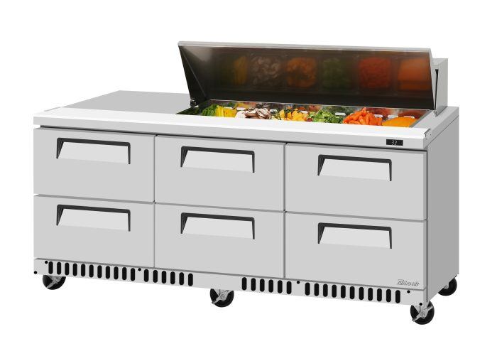 Super Deluxe Sandwich/Salad Prep + Work Station, Front Breathing airflow, Three-section, 72-5/8″W x 30″D x 37-5/8″H, 20.5 cu. ft., (12) 1/6 size 4″ deep pans, (6) drawers, cold air compartment, insulated pan cover, 9-1/2″D cutting board, digital temperature control &, monitoring system, LED interior lighting &, fan control, stainless steel interior &, exterior (galvanized steel back &, bottom), self-cleaning condenser equipped, R290 Hydrocarbon refrigerant, 3/8 HP, 115V/60/1, 9.9 Amps, NEMA 5-15P, cETLus, ETL-Sanitation, Made in USA (contact sales for lead time)