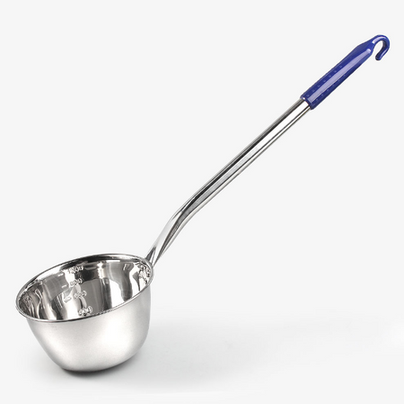 Convenient to use stainless steel ladle has measurement markings on the inside of the ladle bowl for easy measuring. Long handle for convenient dipping in deep pots.