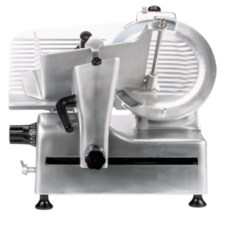 Globe's G12A automatic slicer is perfect for mid-volume operations. The enhanced features of the G-series generate optimal slicing quality for meat and cheese. The extended rod, end weight and chute can accommodate product up to 10.5" in length and the pyramid-shaped end weight teeth improve product hold during slicing.