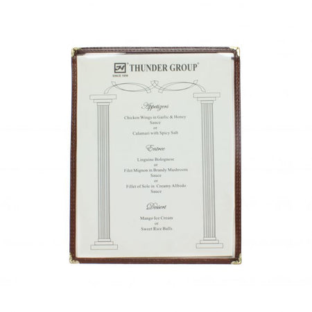 This one page menu folder protects menus with a flexible plastic laminate cover. These folders are a commercial grade product ideal for commercial use. Each folder can hold 1-4 pages (letter sized 8 1/2" x 11").