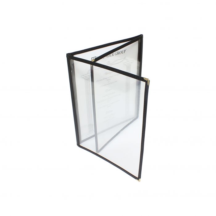 This three page menu folder protects menus with a flexible plastic laminate cover. These folders are a commercial grade product ideal for commercial use. Each folder can hold 1-6 pages (letter sized 8 1/2" x 11").