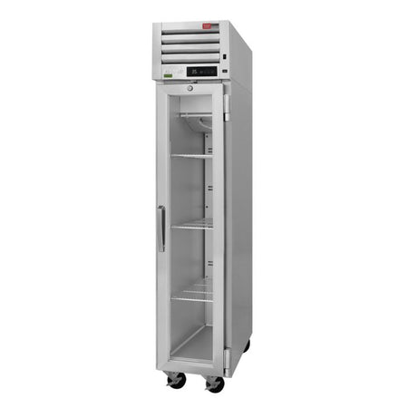 PRO Series Refrigerator, reach-in, one-section, 9.47 cu. ft. capacity, 17-3/4″W x 27-1/4″D x 78″H, top mount self-contained refrigeration, self-cleaning condenser device, digital temperature controller, self-diagnostic monitoring system, hot gas condensate system, automatic fan motor delays, (1) hinged glass door with lock, lifetime guaranteed heavy duty hinges & handles, LED interior lighting, (3) stainless steel wire shelves, stainless steel interior & exterior (galvanized top & bottom), R290 Hydrocarbon refrigerant, 1/4+ HP, 115v/60/1-ph, 2.5 amps, NEMA 5-15P, cETLus, ETL-Sanitation, Made in USA (contact sales for lead time)