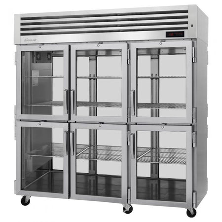 PRO Series Pass-thru Heated Cabinet, Three-section, stainless steel interior and 22 gauge exterior, (12) self-closing half glass doors with stay open feature, Lifetime guaranteed heavy duty hinges and handles, Digital temperature control, Led interior lighting, (9) stainless steel shelves, 5″ casters, 3000W, NEMA L14-20P, 208V/115/60/1, ETLus, ETL, MADE IN USA