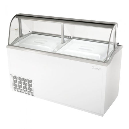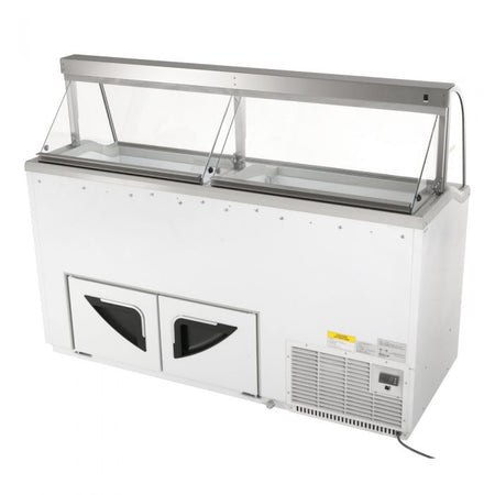Ice Cream Dipping Cabinet, 68″W, (12) 3 gallon can capacity, (8) storage, (3) ABS night cover standard, (12) plastic can holders, LED lighting interior lighting, Manual defrost, PE coated removable magnetic frost shields, White exterior, ,6.7 Amps, 1 HP, 115V/60/1, NEMA 5-15P, cETLus, ETL-Sanitation