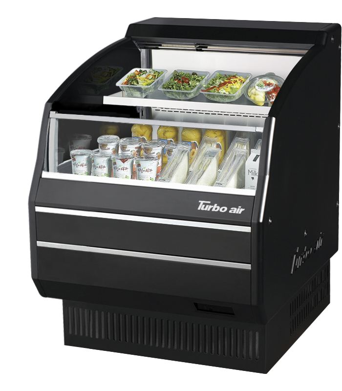 Horizontal Open Display Merchandiser, low-profile, 5.1 cu. ft. capacity, 28-1/8″W x 33-1/2″D x 45-7/8″H, self-contained refrigeration, self-cleaning condenser, tempered glass front shield, solid side panels, (1) adjustable shelf, LED interior lighting under each shelf, specify interior, R290 Hydrocarbon refrigerant, 1/3 HP, 115V/60/1, 7 Amps, cord with NEMA 5-15P, cETLus, ETL-Sanitation